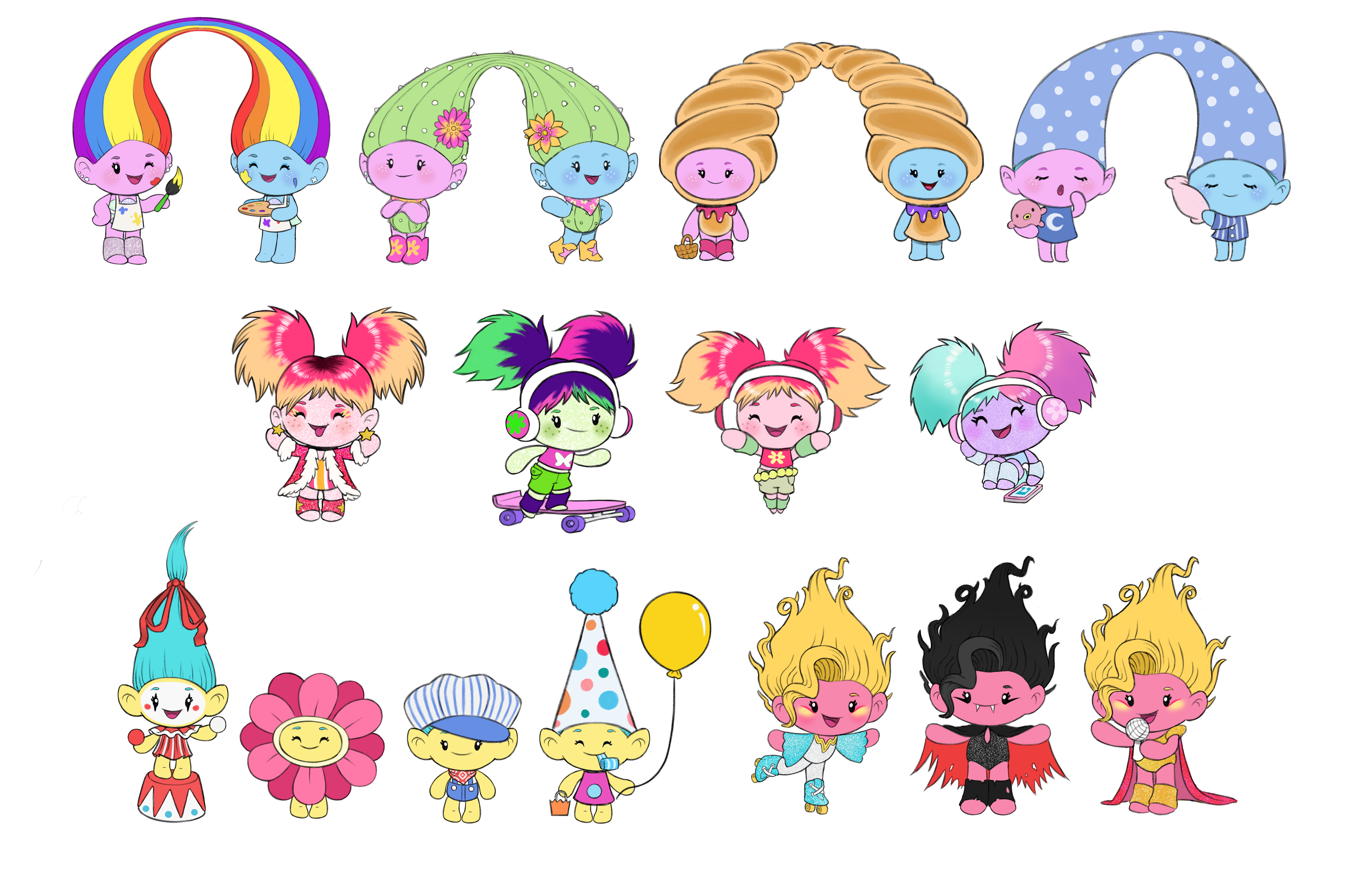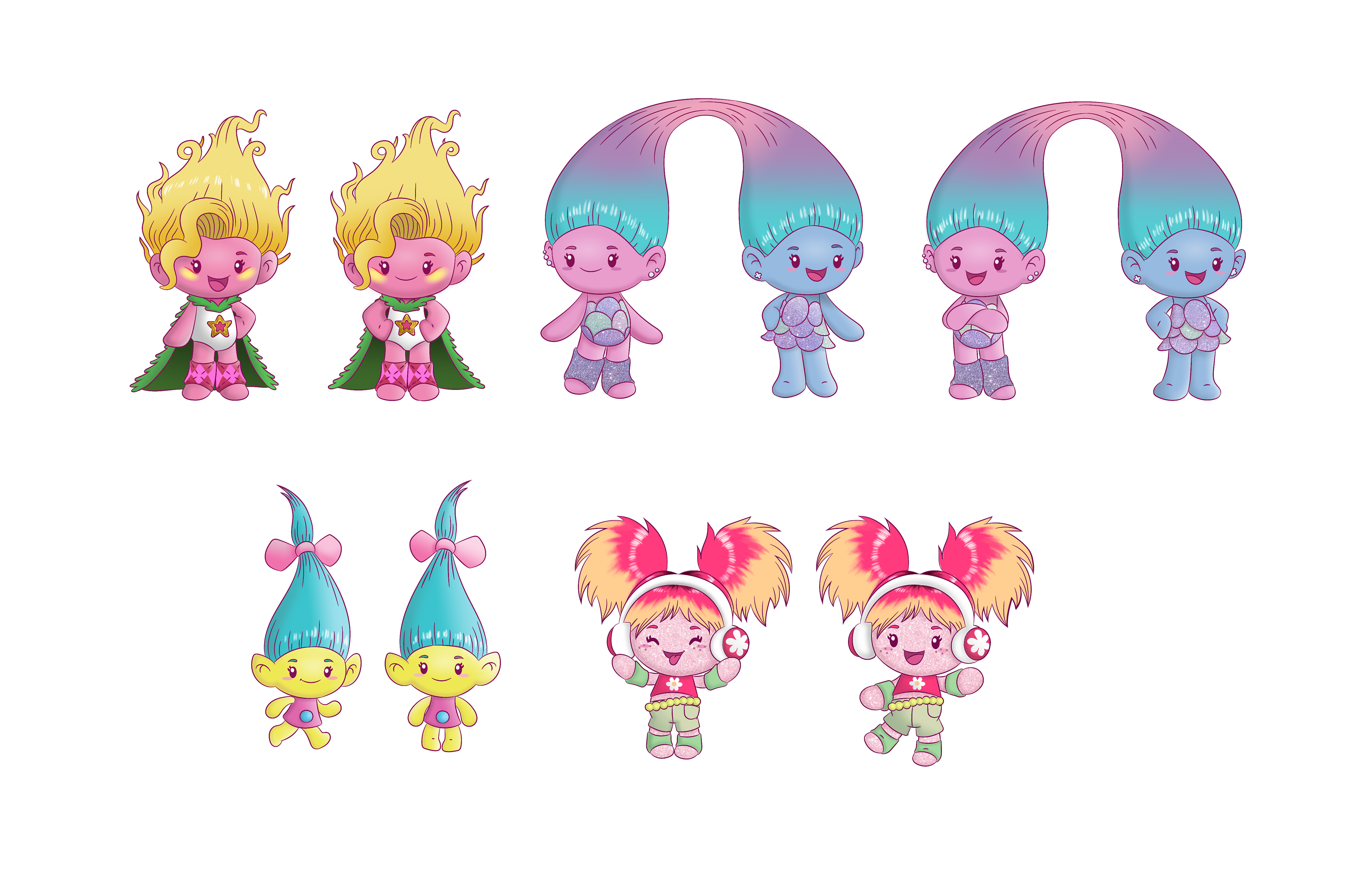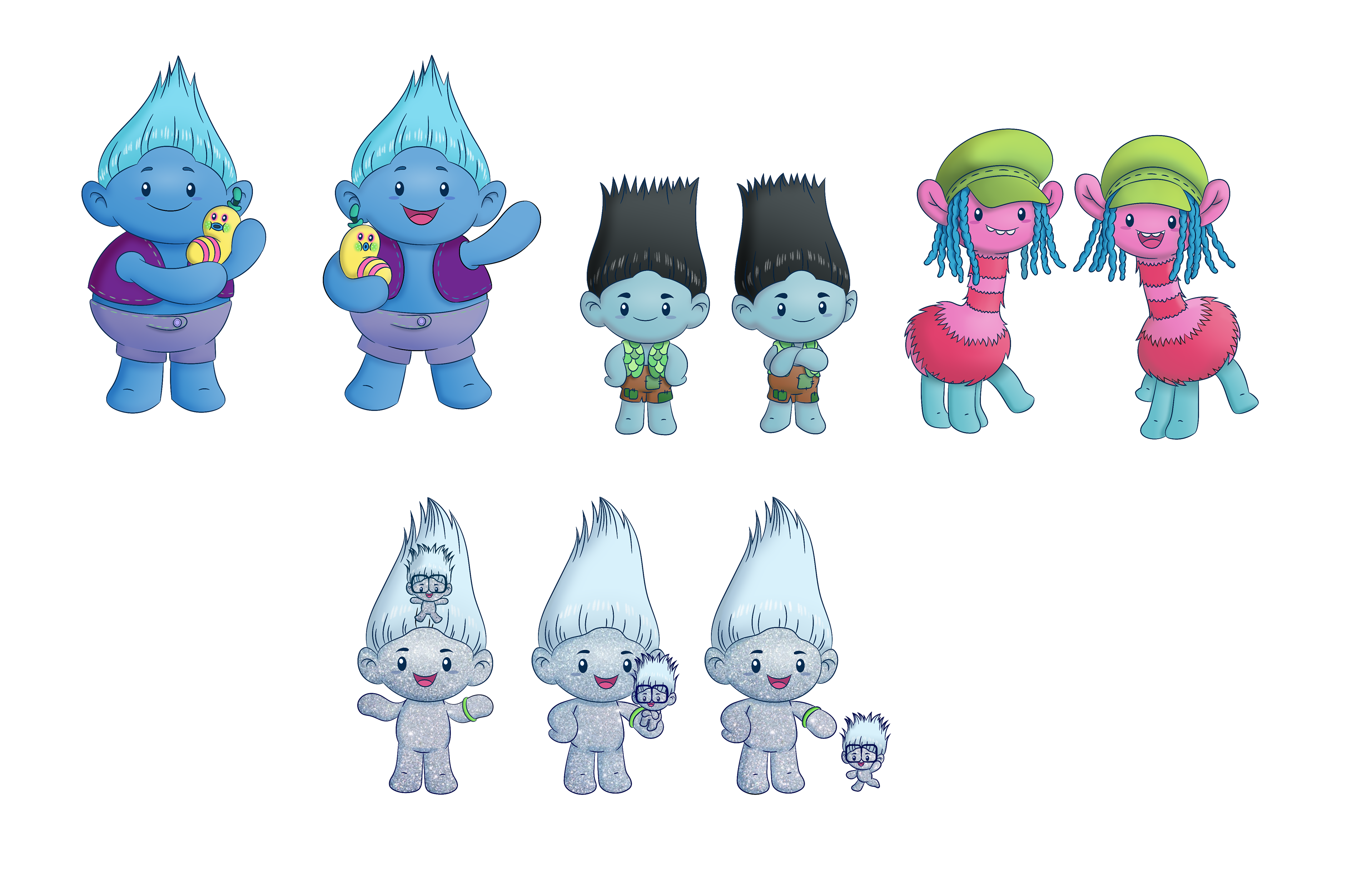 Collectibles for NBCU Consumer Products. I did not not create this chibi style, but drew them in these poses and rendered them. (The headphone wearing Troll was my own design though.)