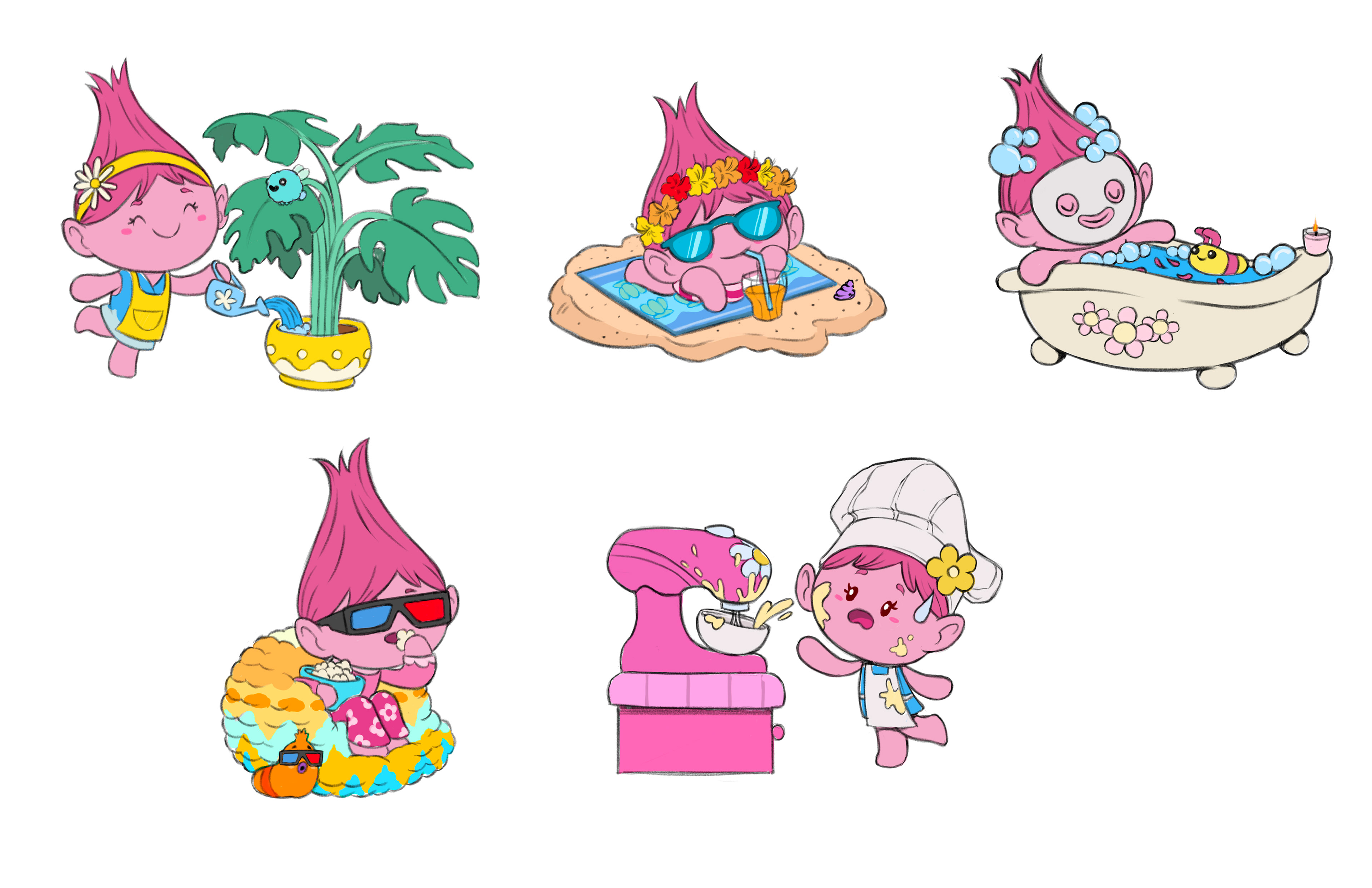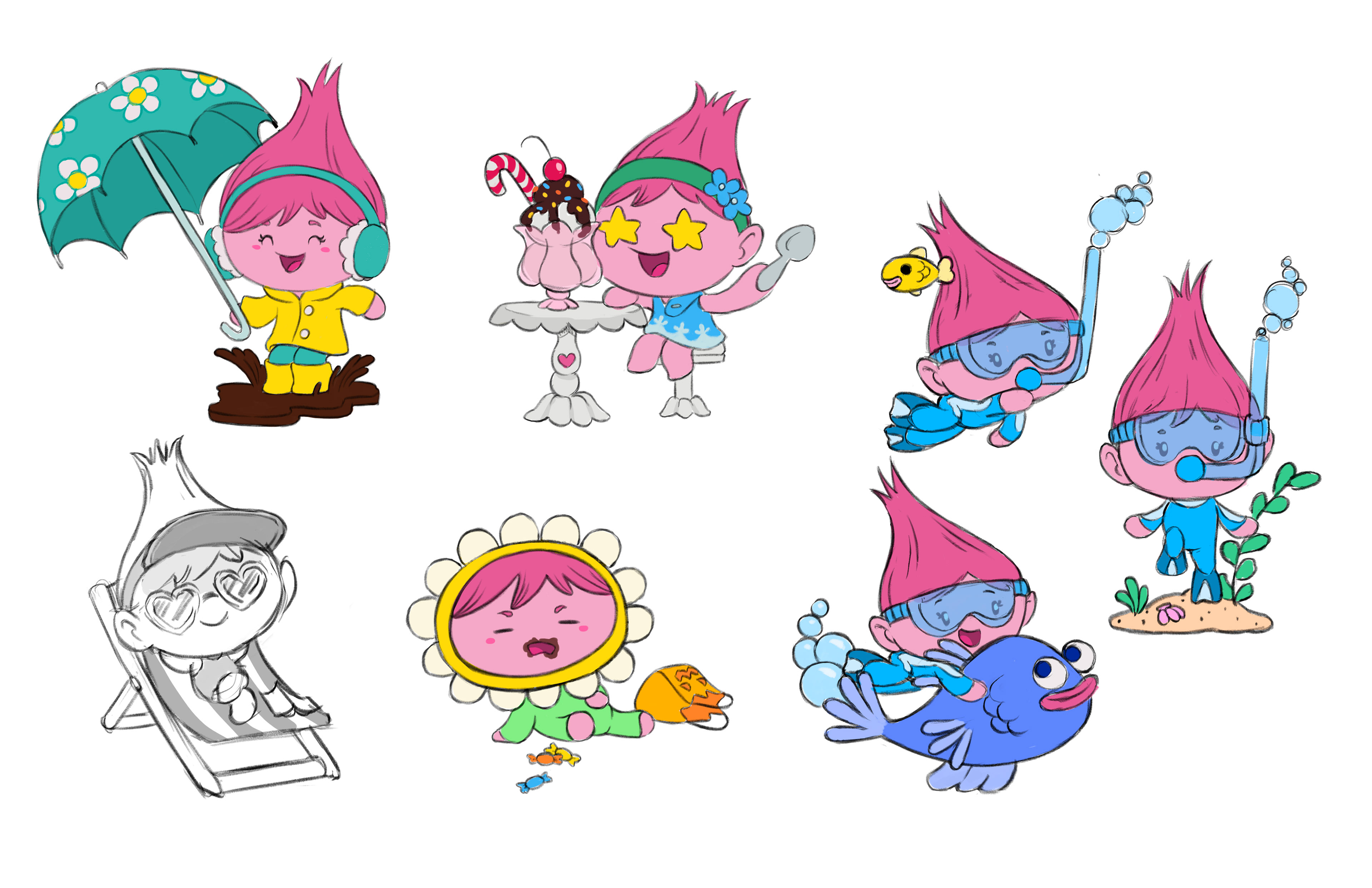 Rough figurine concepts for NBCU. The aim was to show Poppy in relatable real world situations.
